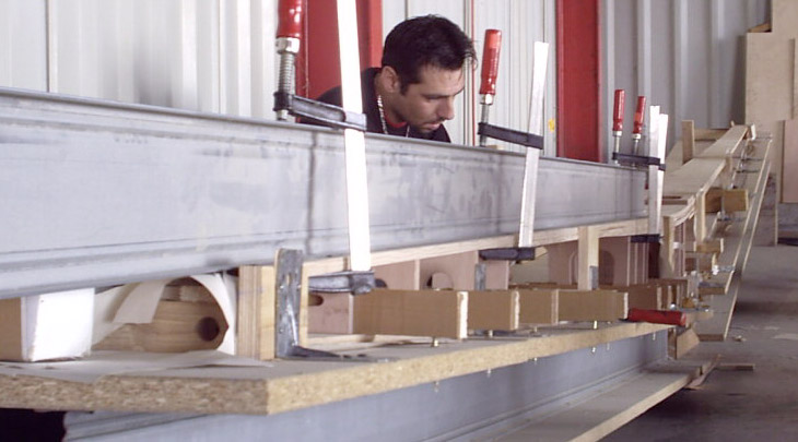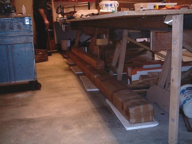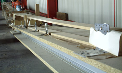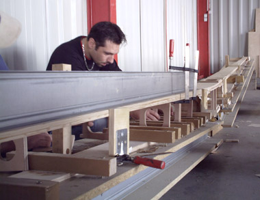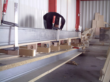 La contruction du longeron: Le longeron est réalisé en assemblant deux semelles en pin, réunies par des diaphragmes à intervale régulier et par deux ames verticales en contreplaqué: Le premier pas consiste à fabriquer les semelles. La semelle supérieure est constituée de deux planches constituant un "lamellé collé". Une planche de 7,90 m est realisé avec deux planches de 4 m réunies par une enture. La semelle inférieure est constituée avec 3 planches réunies suivant le même procédé.